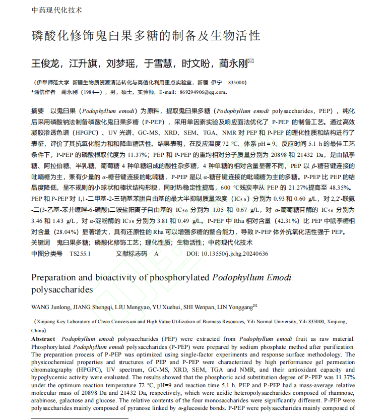 磷酸化修飾鬼臼果多糖的制備及生物活性【伊犁師范大學(xué) 王俊龍,江升旗,劉夢瑤,于雪慧,時文盼,藺永剛】